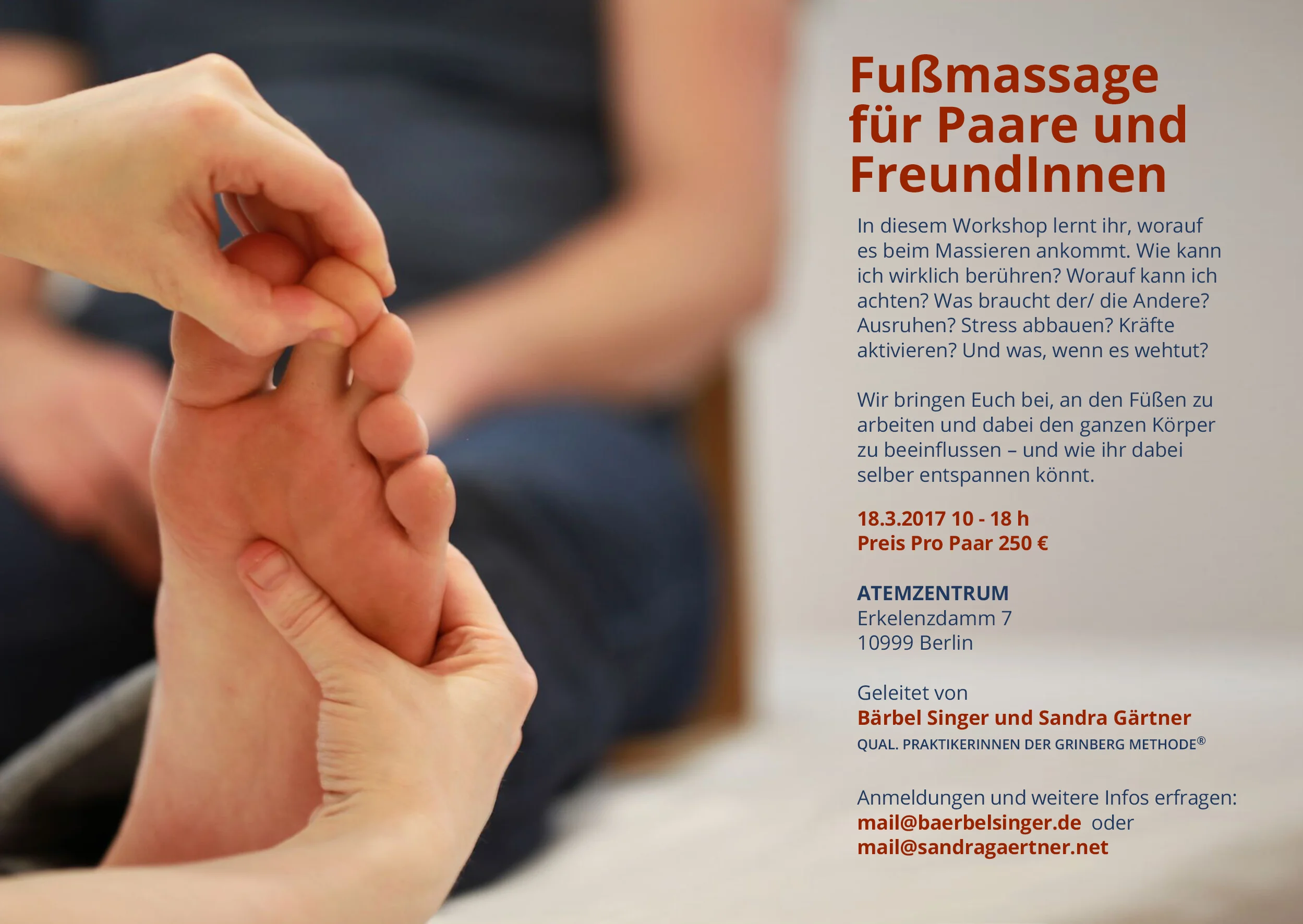 Das Neue Jahr bringt neue Ideen und Möglichkeiten. Ich freue mich auf viele neue Schritte und einer davon ist dieser Workshop von Bärbel Singer und mir. Wir wollen Euch zeigen, worauf es ankommt, wenn ihr Euch gegenseitig nach einem langen Tag die Füße massieren wollt. Für mehr Wohlfühlen im Wohnzimmer ;-)